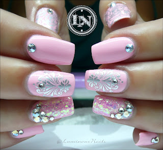 Acrylic Overlay with Gfa Marshmallow Collection M08, Konad Stamping, Young Nails Caption Silver Polish rewind repeat, touched by colour nail art Crystal Moonlight Swarovski Crystals. #gellyfitaustralia #stamping #swarovskicrystals #pink #cute #Luminousnails