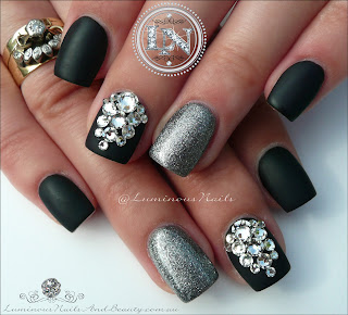 Acrylic Overlay with Gfa SS220, G01, Swarovski Crystals. #gellyfitaustralia #luminousnails #matteblack #steelgrey Bling #cutenails #glamorousnails